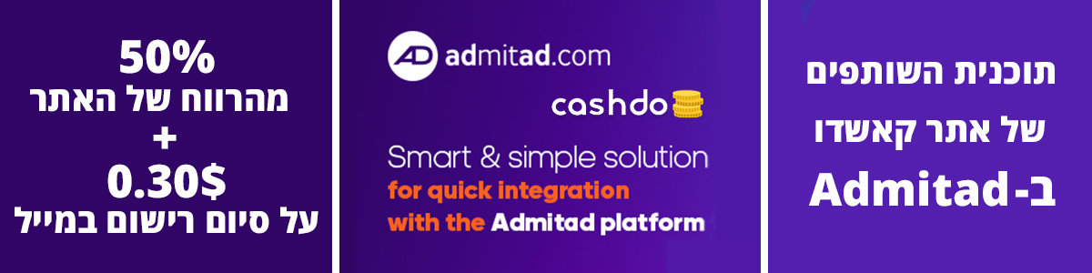 במסגרת תכנית השותפים של אתר קאשדו במערכת אדמיטד אנחנו משלמים 0.30$ על כל משתמש חדש שהשלים את הרישום דרך המייל ו-50% עמלה על כל הקניות של המשתמש!